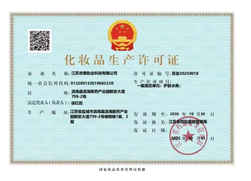 《化妆品生产许可证》这一资质的获取,为其多肽抗皱护肤类产品的规模化、专业化、合规化生产与市场布局奠定了坚实基础。