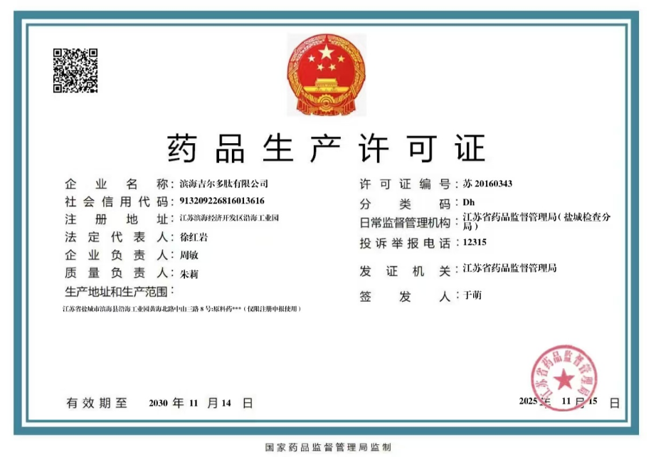 它们分别是,吉尔集团旗下吉泰肽业的“化妆品生产许可证”
