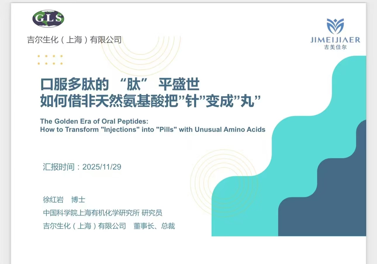 泰州市人民政府主办、同写意策划,以“创新转化赢得新未来”为主题,一年一度的医药盛会,今天在泰州隆重开幕! 吉尔公司将做关于借特种氨基酸修饰实现多肽药口服目标的报告。本次展商300多家,报告嘉宾350多人 ,目前报名参会人数超过5000人